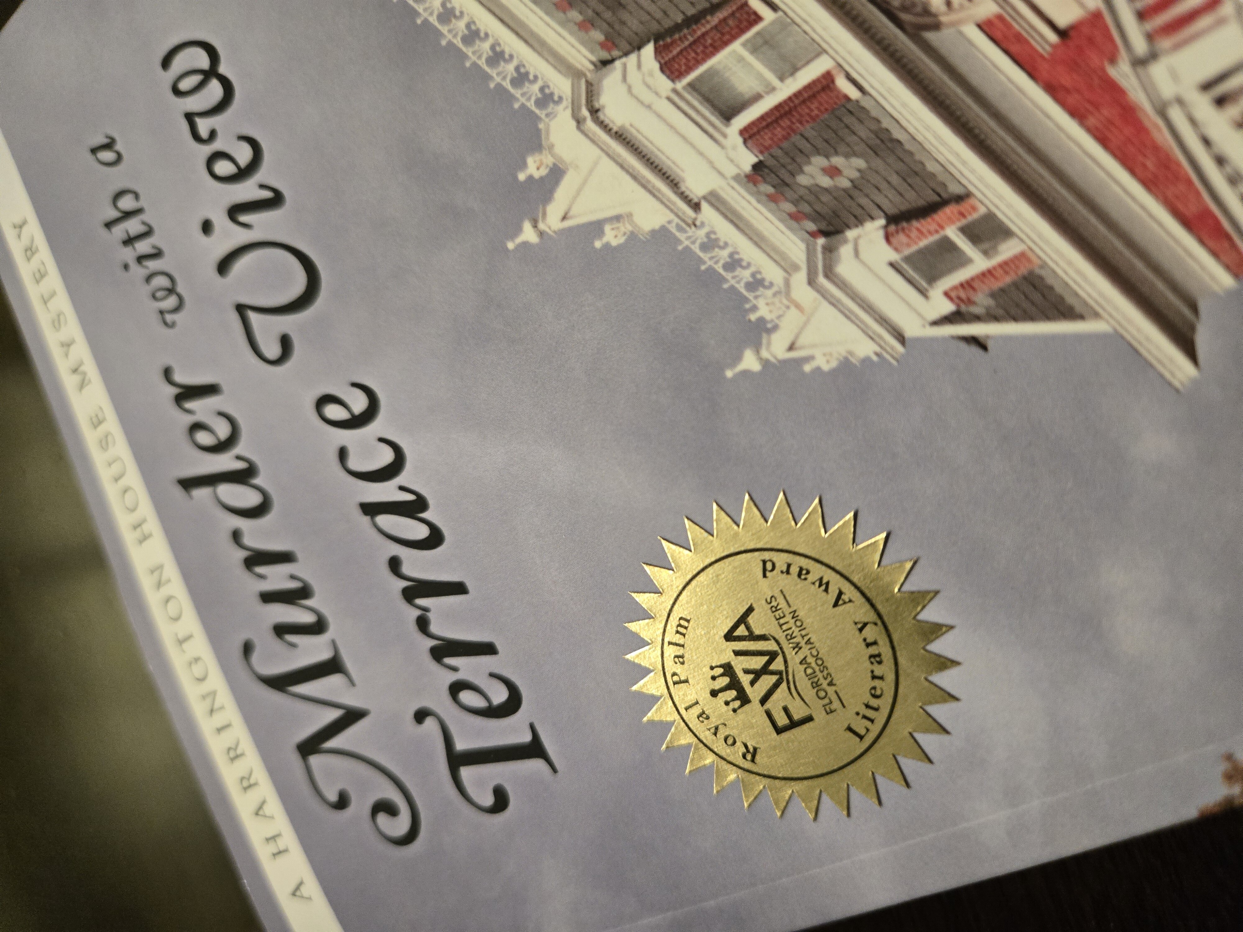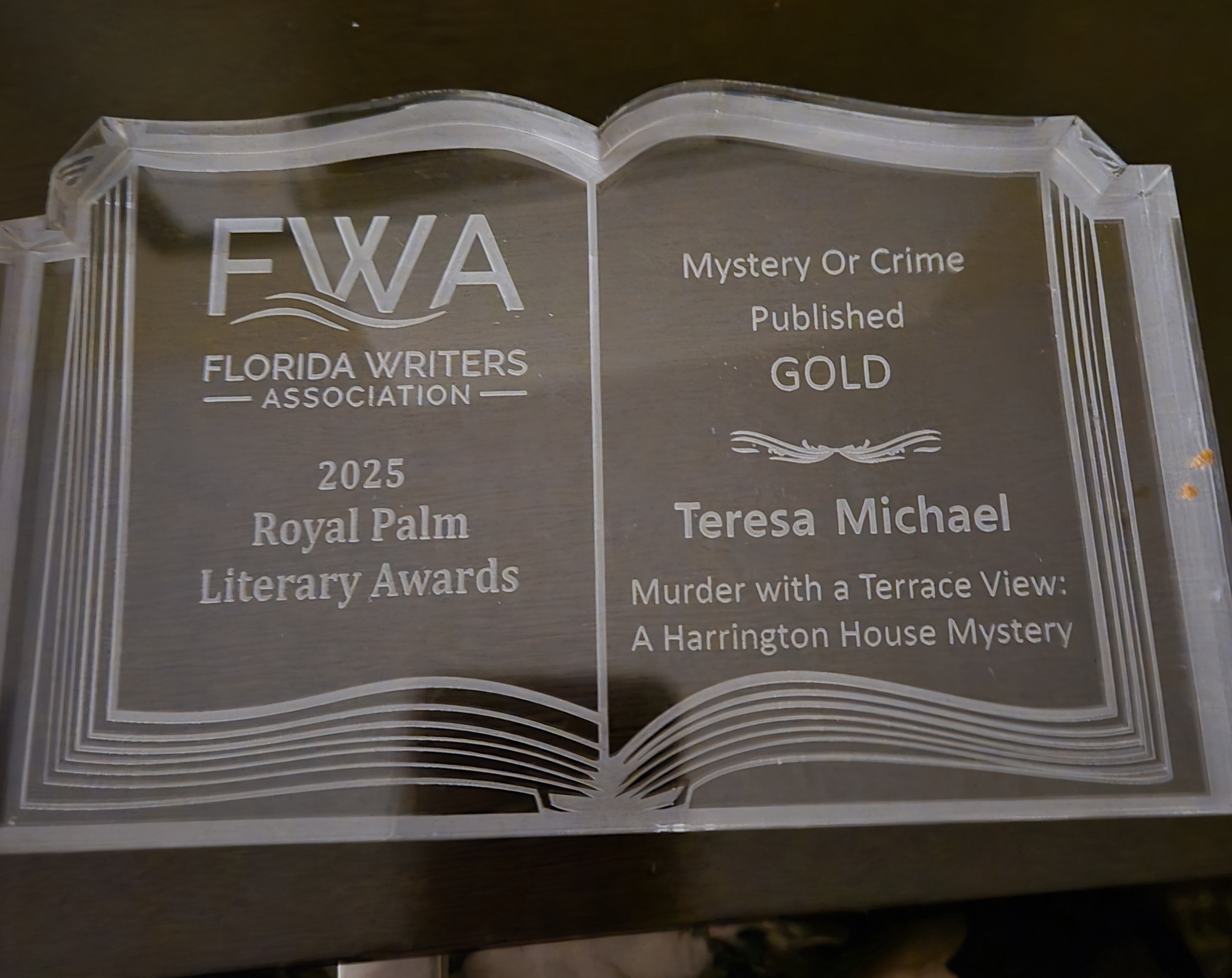 On October 18, 2025 at the Florida Writers Association Annual WriterCon Conference, Murder with a Terrace View won the GOLD for the Royal Palm Literary Award for Mystery. I was so excited to accept this award. This is the first time I've won a big award like this - so very excited and so very grateful to my critique groups, my readers, the bookstores and gift shops that offer my books, and most of all my family. Love the gold medal stickers they gave me to put on my books!